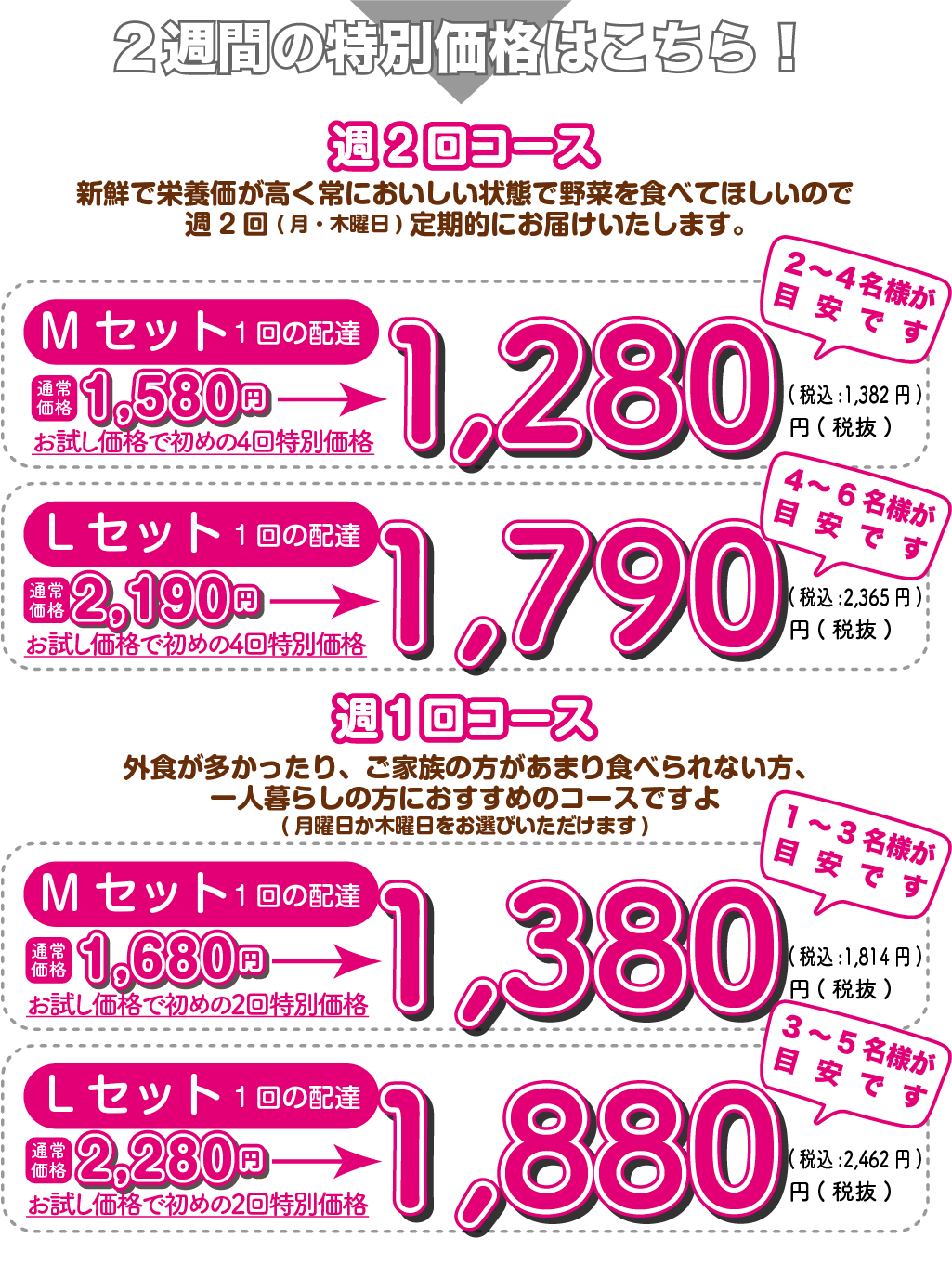 ※天候などの都合で予告なく、変更させていただく場合がございますので、ご了承くださいませ。 週2回コース Mセット Lセット 新じゃが:メ…
