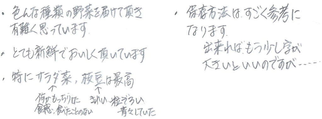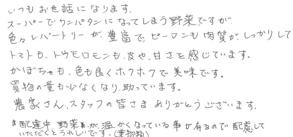 これからも「頼んでよかった」と思っていただけるような野菜の宅配を目指しますので、よろしくお願いいたします。