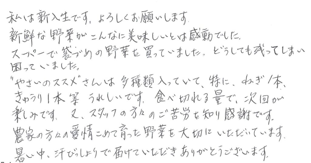 お届けする野菜が、ご家庭の食卓で笑顔や健康につながっていましたら、とても嬉しく思います。